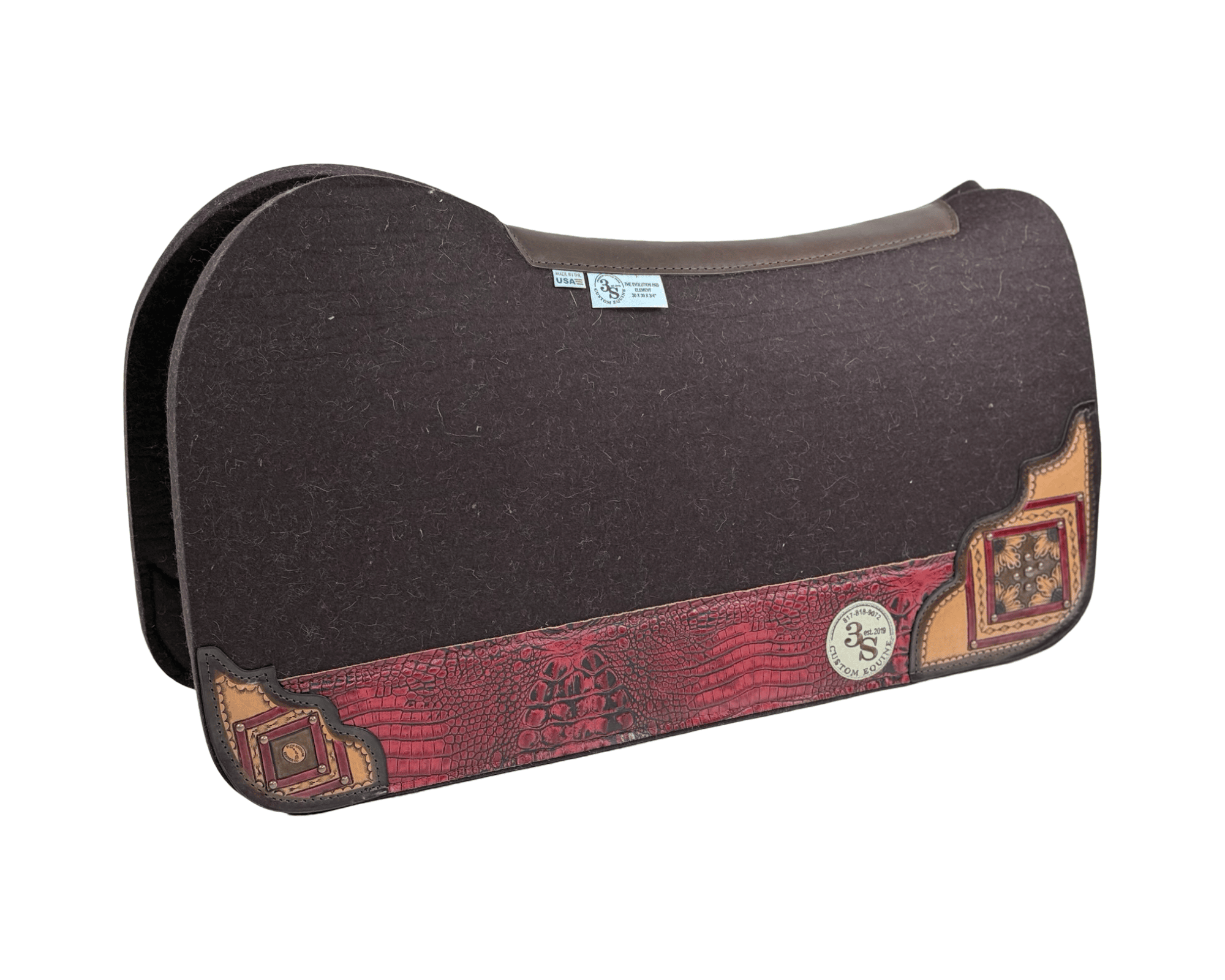 Evolution Pad – 30x30x3/4″ Element Wool – Chocolate – Hand Tooled Red Flower/Spots Corners – #14 Wear leather