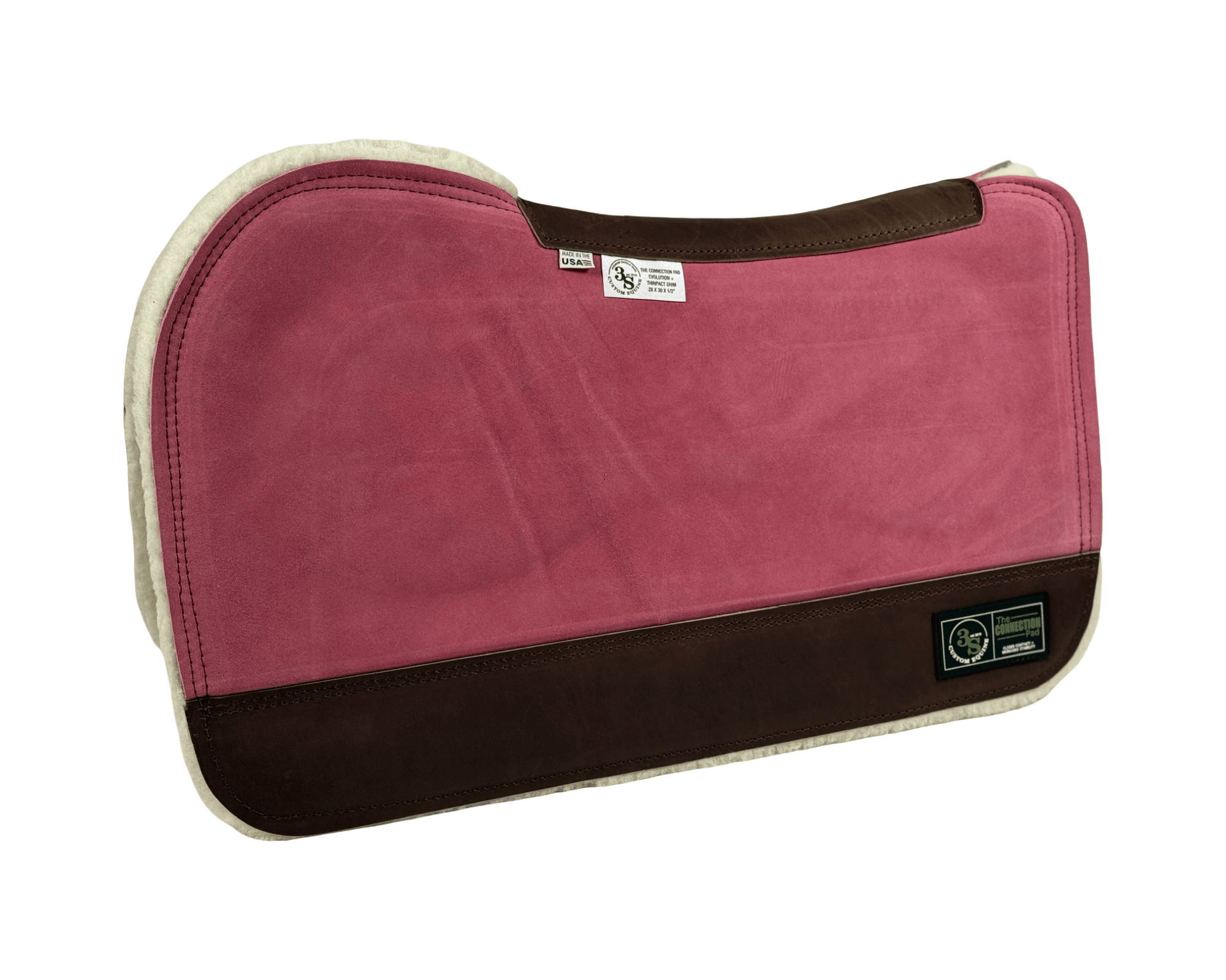 The Connection Pad – Evolution 28x30x1/2” + Thinpact Shim – Rose Velvet Suede – Brown wear leather – 100% wool fleece (white)