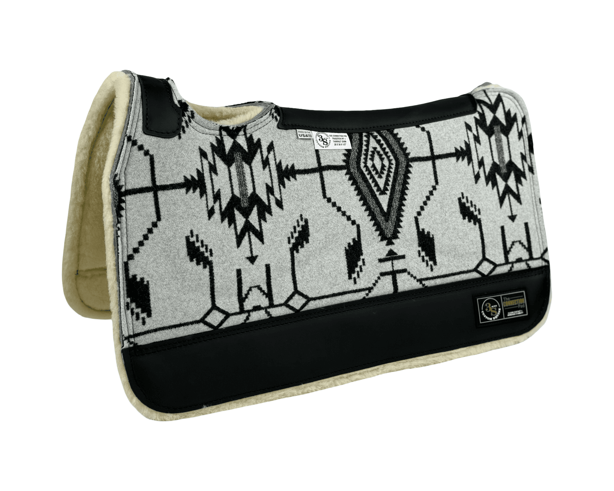 The Connection Pad – Tradition HP 28x30x1/2” + Thinpact Shim – made with Pendleton® fabric – #17 – Black wear leather – 100% wool fleece – Some fraying will occur on edges