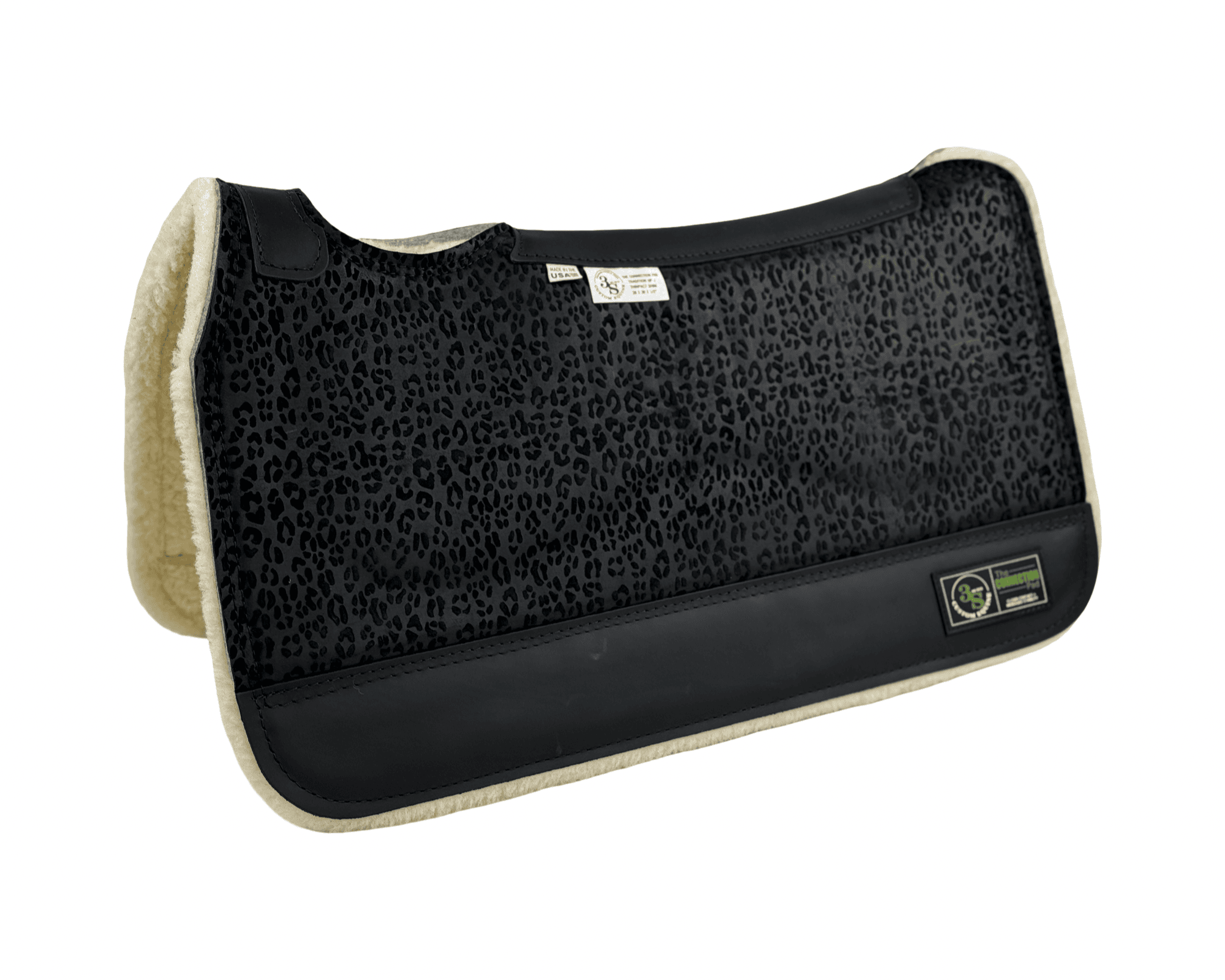 The Connection Pad – Tradition *HP* 28x30x1/2” + Thinpact Shim – Suede Embossed Leopard Black – Black wear leather – 100% wool fleece (White)