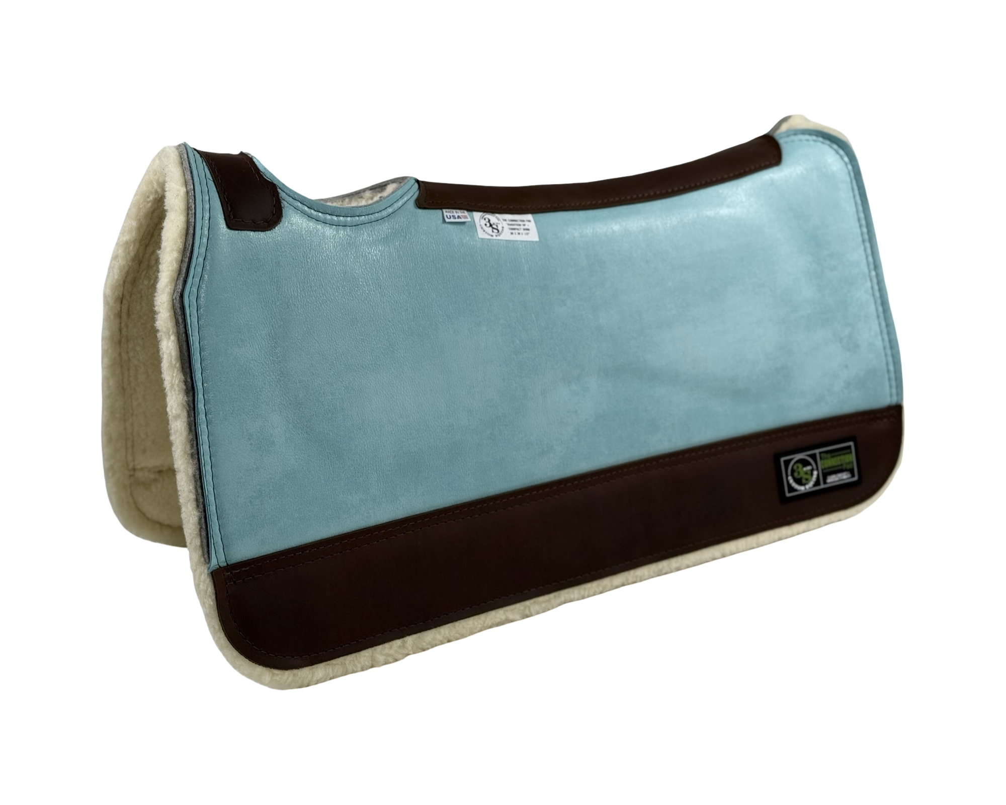 The Connection Pad – Tradition HP 30x30x1/2” + Thinpact Shim – Hard Rock Carribean Blue – Brown wear leather – 100% wool fleece – White