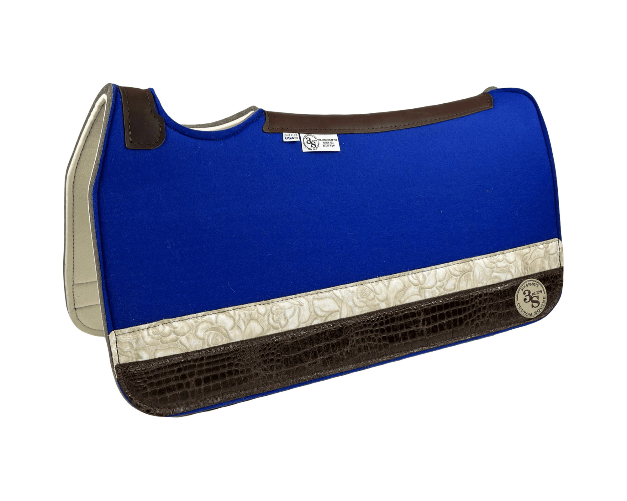 Tradition *HP* Pad – 30x30x3/4″ Fusion Felt – Color Pop Cobalt Blue – Strip Duo 31/16 – Brown Spine leather